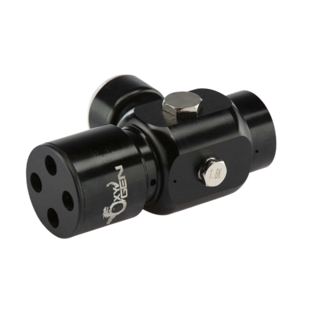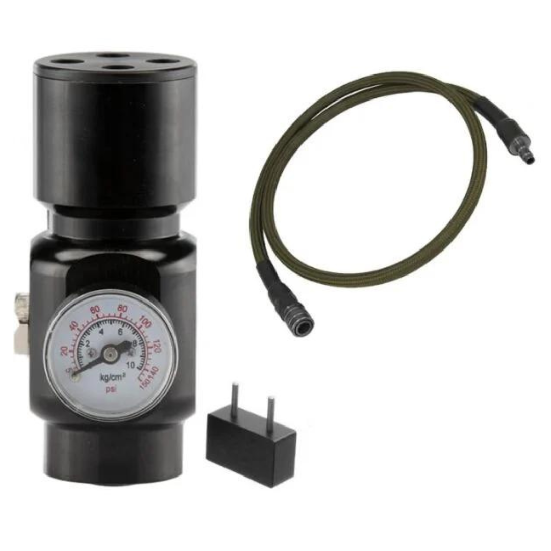 The Oxygen Regulator and Balystik Deluxe Line 100cm in Grey is a low-pressure regulator designed for HPA gearboxes and Gas to Air conversions. It's ideal for use with systems like Polarstar, Wolverine, and Valken, offering precise pressure control for optimal performance.